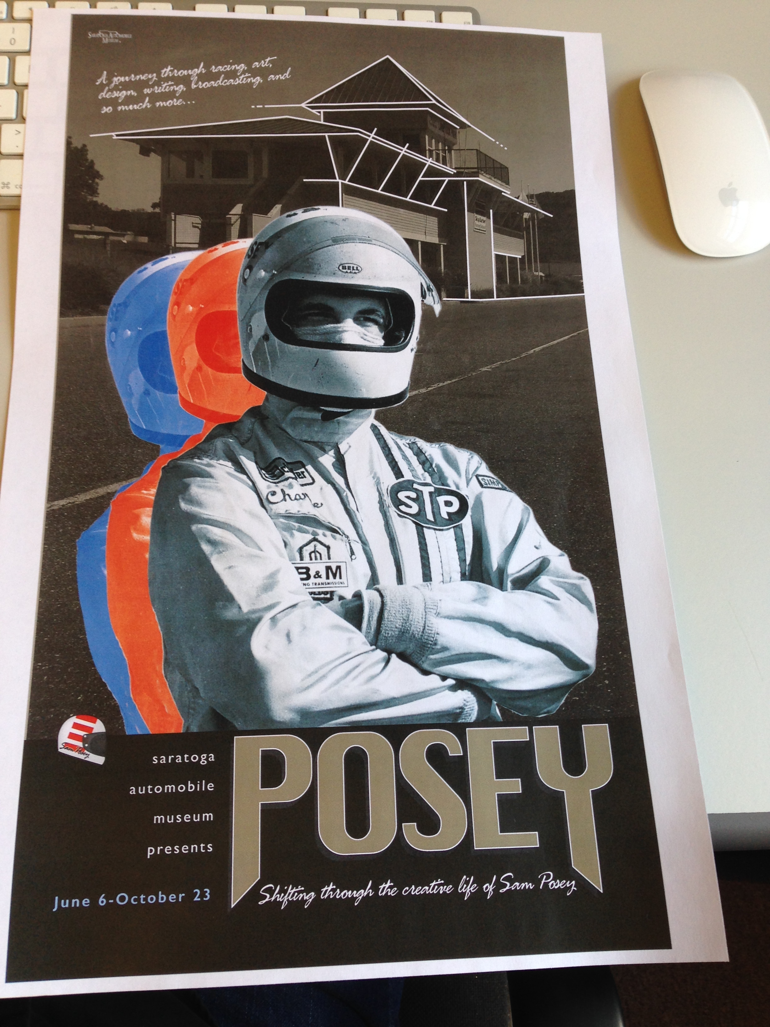 Poster for new exhibition Shifting through the creative life of Sam Posey - First take - combining a building designed by Sam and adding the architectural lines helps tell more of the story - This will be the first piece seen in the Exhibition.